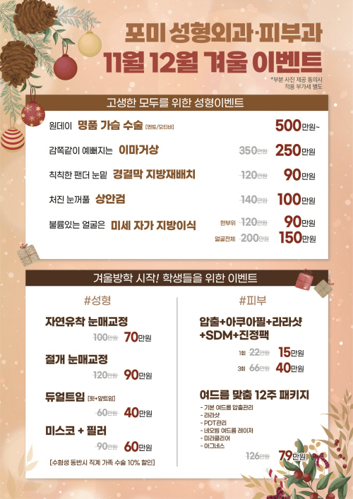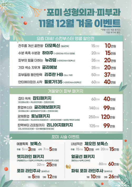 포미성형외과 11월,12월 겨울 이벤트 페이지 정보 작성자 포미성형외과 작성일23-11-02 18:59 조회3,905회 관련링크 이전글 다음글 목록 답변 본문 포미성형외과 11월, 12월 겨울 이벤트 이전글 다음글 목록 답변