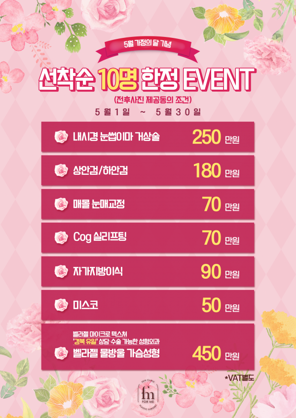 5월 가정의달 선착순 10명 한정 이벤트! 페이지 정보 작성자 포미성형외과 작성일18-05-03 17:34 조회2,076회 관련링크 이전글 다음글 목록 답변 본문 - 이전글 다음글 목록 답변